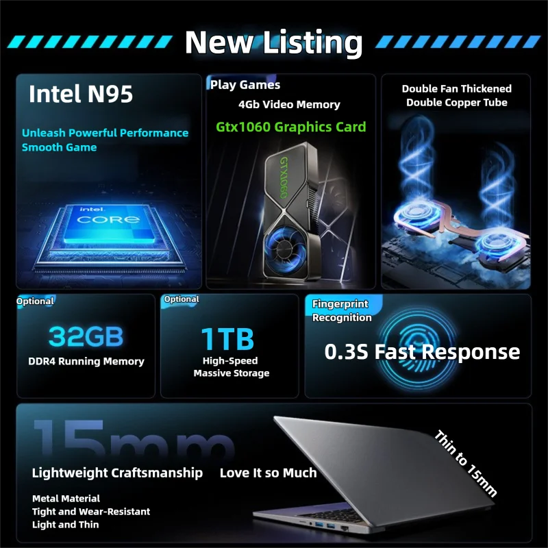 15,6 «intel N95 gtx1060 portátiles para juegos ordenador portátil pc 32GB DDR4 1TB SSD portátil Gamer Windows11 teclado retroiluminado